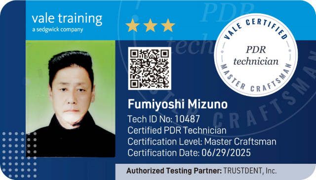 また、このライセンスは トラストデントグループだけに限定されているものではありません。 希望すれば、誰でも審査を受けられる仕組みになっています。 そのため、ライセンスを取得することで、技術力の裏付けとなり、お客様により安心してデントリペアをお任せいただけるようになります。